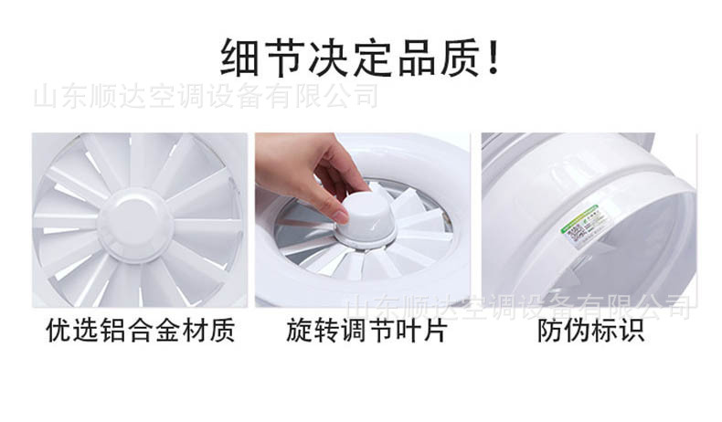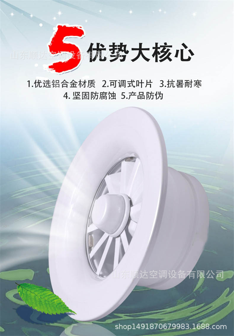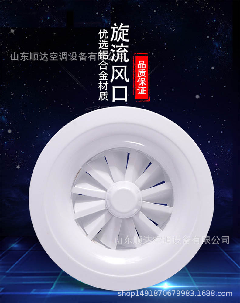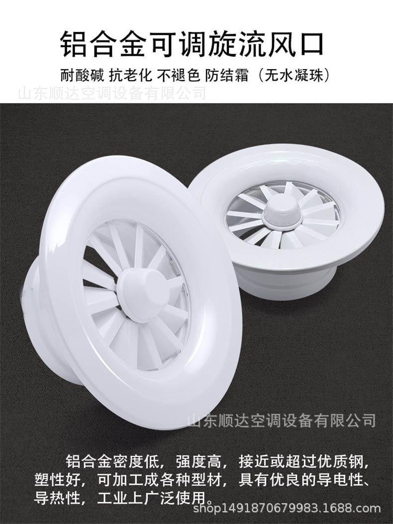 旋流風口是空調系統中的一個排風工具。在空調通風系統中可用作大風量,大溫差送風以減少風口數量,安裝在天花板或頂棚上,可用于3米以內低空間,也可用二種高度大面積送風,高度甚至可達10米以上。 旋流風口送出旋轉射流,具有誘導比大,風速衰減快的特點。 ■材質:不銹鋼,鋼板,鋁合金 ■規格尺寸:支持定制,配合設計尺寸